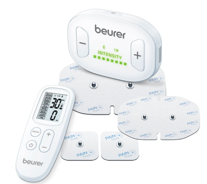 - Tratamiento del dolor (TENS) - Estimulación muscular (EMS) - Relajación y masaje - Incl. mando a distancia para el control - Incl. extensión de electrodos - 4 electrodos autoadhesivos, incluido 1 electrodo grande (190 x 95 mm), 1 electrodo mediano (110 x 75 mm) y 2 electrodos pequeños (50 x 50 mm) - 1 canal regulable - 19 aplicaciones preprogramadas - Selección de programas con el mando a distancia - Posibilidad de ampliación con dos pequeños pads de gel + cable de conexión - Intensidad regulable a través del aparato o del mando a distancia - Temporizador de cuenta atrás - Desconexión de seguridad - Incluye batería recargable (250 mAh) - Descarga gratuita de la app "beurer PainAway" - Compatible a partir de iOS 10.0 y Android 5.0, a partir deBluetooth®4.0