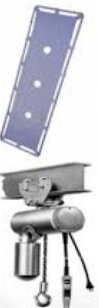 para la sujeción al polipasto - Medidas: largo de la camilla 200 cm y ancho 70 cm - Camilla montada a un sistema de carga de altura variable - Variación de altura de 3 m a 80 cm - Sistema de elevación eléctrico mediante polipasto de 1HP, motor reversible