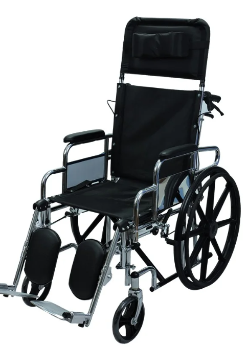 SILLA DE RUEDAS CON RESPALDO LARGO RECLINABLE DESCANSA BRAZOS CORTOS DESMONTABLES Y ELEVA PIERNAS ASIENTO DE 18” (46 CM)